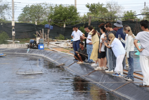 8 月 25 日,访学团师生深入越南水产生产一线,走访海大技术服务站、香螺养殖基地及对虾养殖基地,了解当地养殖状况。