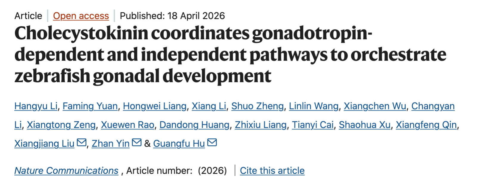 呼光富副教授团队在国际学术期刊《自然·通讯》(Nature Communications)在线发表题为“Cholecystokinin coordinates gonadotropin-dependent and independent pathways to orchestrate zebrafish gonadal development”的研究论文。该研究系统揭示了经典脑肠肽——胆囊收缩素(Cholecystokinin,CCK)通过促性腺激素依赖和非依赖两条途径,协同调控鱼类性腺发育全过程的新机制。