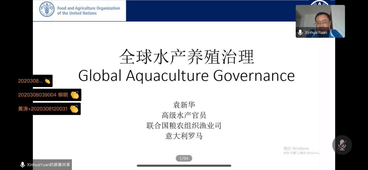 水产讲坛通过腾讯会议在线上举行,联合国粮农组织渔业司高级水产官员袁新华博士应邀作了题为“全球水产养殖治理”的报告,并就在校生申请国际组织实习机会给予指导意见。200余名师生参加了报告会,报告由91吃瓜网
