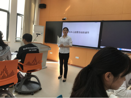 正式上课后,汤蓉老师首先介绍了心血管活动调节的相关途径,之后通过丰富的实践经历、轻松的授课语言、专业的学科知识、深厚的科研积淀,从心脏神经的支配、血管神经的支配、心血管反射三个方面完成了本节课的主要讲授内容。接下来,水产养殖1801班的王旭同学结合动物生理学的基础知识,向同学们分享了CPR和AED的基本原理,他将直观生动的动画插入到PPT中,通过动画所展示的步骤一步步深入地讲解,赢得了同学们的阵阵掌声。而后,向舒鹏同学根据近段时间来给同学们测量血压的经验,绘制出思维导图,分析了血压的短期调节方法,受到了老师的赞誉。