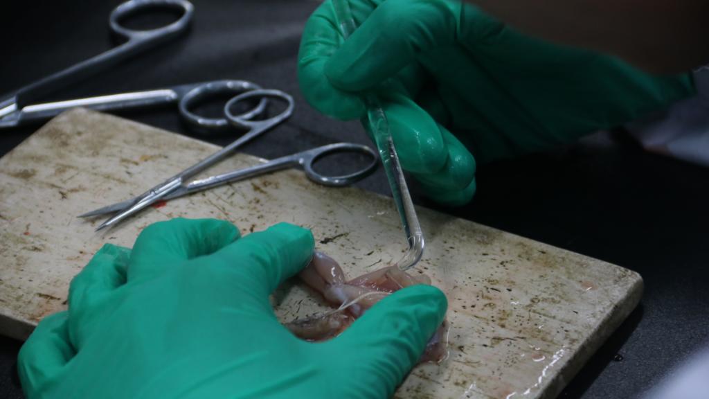 的杨东烨用左手拇指按住青蛙的背部,食指按住青蛙头前部,另一只手持着毁髓针,轻车熟路地找到了青蛙的枕骨大孔。杨东烨说:“找到枕骨大孔后要捣毁脑组织和脊髓组织,破坏完全的青蛙的四肢是松软的。这也是后续实验步骤的基础。”接着她用剪刀剪断蛙的脊柱,剥去皮肤和内脏组织,分离双腿,小心翼翼地用玻璃分针分离坐骨神经。在成功制作标本后,她长松了一口气。她说:“在比赛过程中,心态才是真正的决胜因素。”