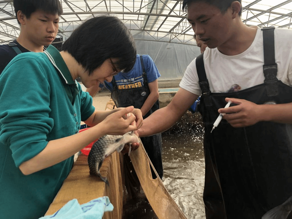 每日清晨,高老师都会和黄冈市团风实习点的同学们一起给亲鱼注射催产药物,只见她撸起衣袖,用左手提起鲫鱼的胸鳍,右手拿着催产针与鱼身体呈45°,轻松流畅的将药物推入鱼体。一条又一条,手把手的指导,用自己丰厚的专业知识为学生解答实践中的疑惑。