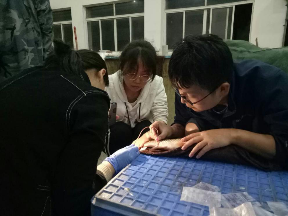 除了苗种生产方面的工作,为丰富队员们的实习生活,呼光富老师还根据学生的兴趣,将队员们分为三个小组,每个小组分别负责一个实验。在草鱼采血实验中,他边示范边讲解道:“首先要找到鱼体尾端侧线鳞上的黑色小孔,然后将针头垂直插下去,缓慢试探血管的位置。一般而言,我们要找的血管就在脊椎骨下方,当针插入血管时就能在透明部分看到血珠,这个时候再连接采血管,就能看到血流。”他时刻关注着同学们的反应,并鼓励学生大胆尝试,敢于动手。