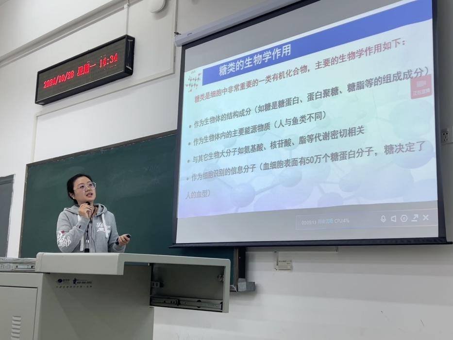 何老师在授课过程中不仅关注生活中的实际应用,也注重与水产专业知识的结合。她在讲解糖类是哺乳动物最重要的能源物质时,特别强调了鱼类糖代谢能力低;在讨论纤维素的酶促讲解时,要求学生比较草鱼与鳜鱼消化道中相关菌群,帮助学生将基础生物化学知识与专业学习相联系,提升对水产专业的兴趣。