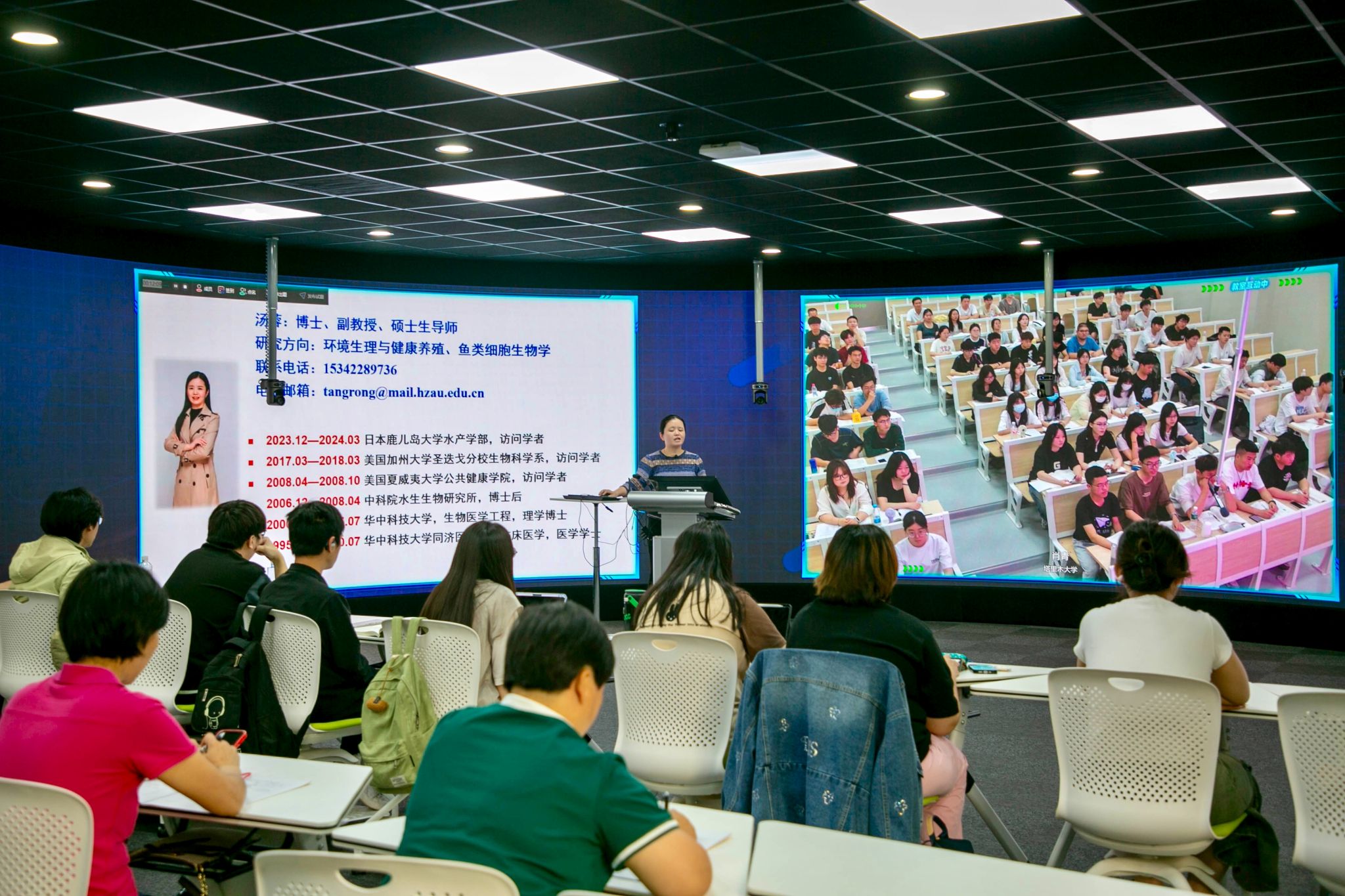 在正式讲授内分泌系统之前,汤蓉简要介绍了自己的学术背景与研究方向。她通过自身从医学到水产的多学科研究经历,鼓励学生们树立终身学习理念,强调基础知识素养对未来职业发展的重要性,鼓励学生们多走、多看、多思,在实践中提升综合能力。