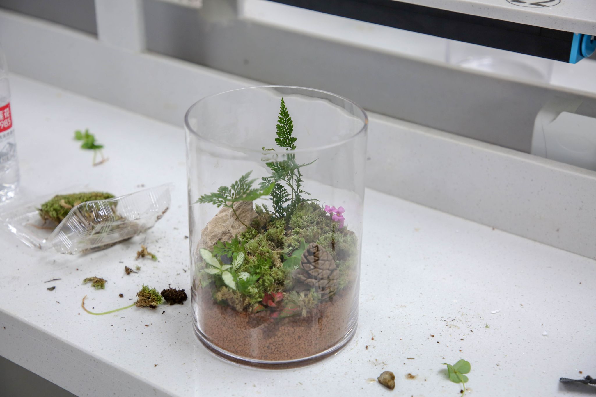 大家充分发挥创意与想象力,将采集回来的苔藓和植物巧妙搭配。他们在玻璃瓶底部铺上一层营养土,再精心摆放上形态各异的小石子,营造出微型的山水景观。接着,用小铲子小心翼翼地将苔藓和植物植入土中,调整好位置,直到满意为止。最后,添上一些可爱的卡通小摆件作为点缀,使生态瓶更加生动有趣。在制作者的巧手下,一个个生态瓶逐渐焕发出勃勃生机,成为了一个个独一无二的微观世界。有的作品仿佛森林一隅,郁郁葱葱;有的宛如高山流水,意境深远;有的又似田园风光,宁静祥和,令人目不暇接,赞叹不已。