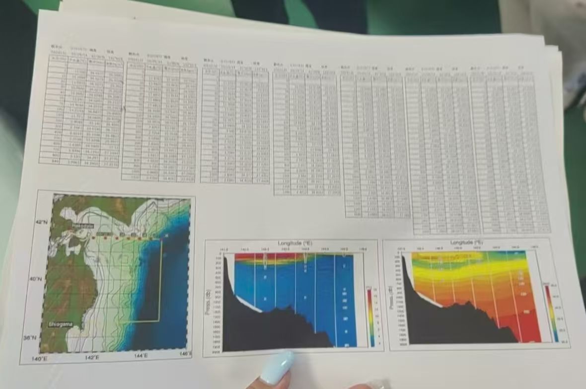 访学第五天,二组成员与来自北海道大学的学生登上了“おしゅう丸”,开展渔业资源调查实习。在海洋科考环节,访学团第一次近距离接触到了CTD检测仪。夜幕降临,同学们体验了海钓。船员将钓上来的鱿鱼做成刺身,清甜鲜嫩的味蕾盛宴是大海的馈赠。