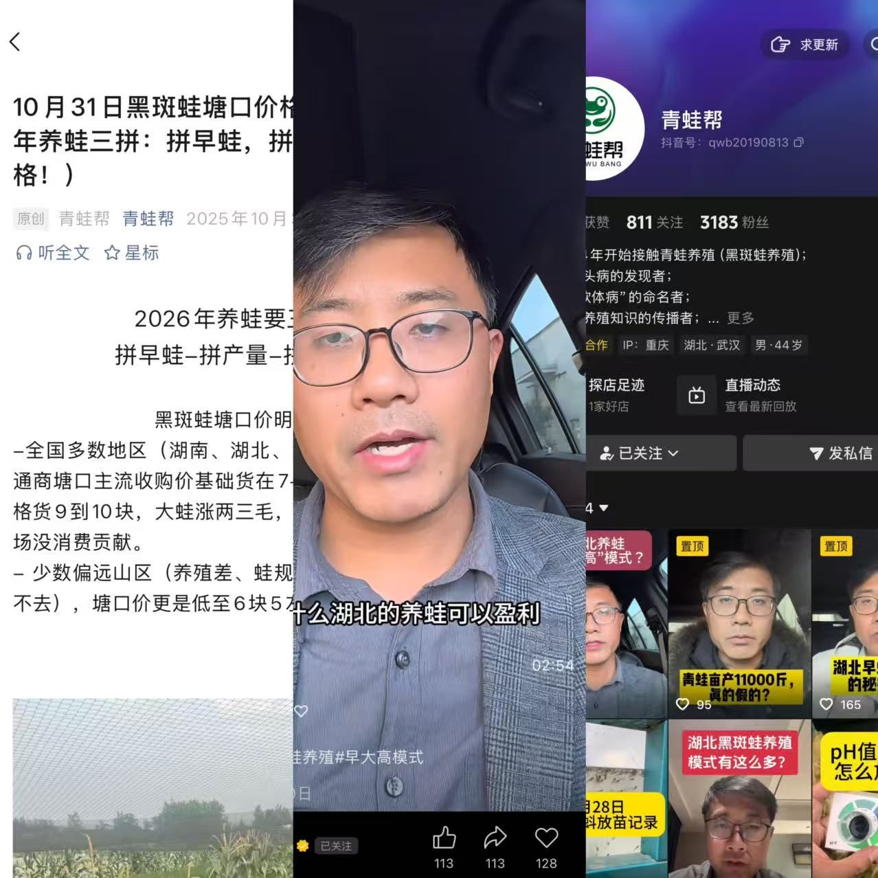 我曾采访过的赵宇江师兄,他从2014年就开始在“青蛙帮”公众号上分享有关黑斑蛙病害防控、塘口管理的经验,经过十年积累,这个公众号成了黑斑蛙养殖领域的“行业教科书”。