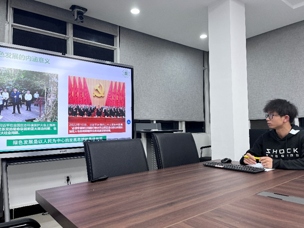 支部党员陈薇淇表示坚持绿色发展,是为了让人民群众过得更加幸福,我们的生态文明要求不是简单的保护自然环境和生态安全,而是把这些要求视为发展的基本要素,归根结底是为了满足人民群众日益增长的物质文化环境等全方位需求。因此,“以人民为中心”是绿色发展的根本目的,也是社会主义制度的本质规定。