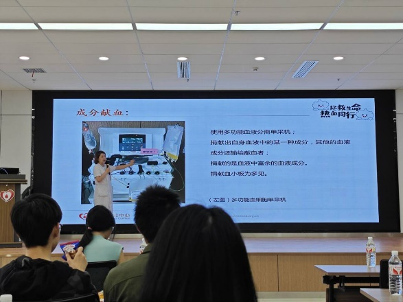 “两次捐献全血之间需要间隔至少六个月,但是捐献成分血对身体影响较小,两次捐献只需要间隔两个星期,这就涌现出了众多的献血模范。”工作人员向同学们介绍道。武汉血液中心的工作人员们不仅用自己温暖的服务保障着全市160多家医院的血液供应,而且以身作则,多位工作人员献血次数超过100次,并且血液中心在儿童节等特定的日期会组织集体献血。同学们也了解到了很多热心市民的感人故事,有的人不仅自己常常献出爱心,而且会引导身边的人也加入到无偿献血的队伍中来,数不清的模范个人、模范家庭、模范团体令在场的各位动容,也让同学们感受到了什么是“生命的传递”,不仅是血液在人与人之间的传递,更是爱心和希望在人与人之间的传递,直至无限。