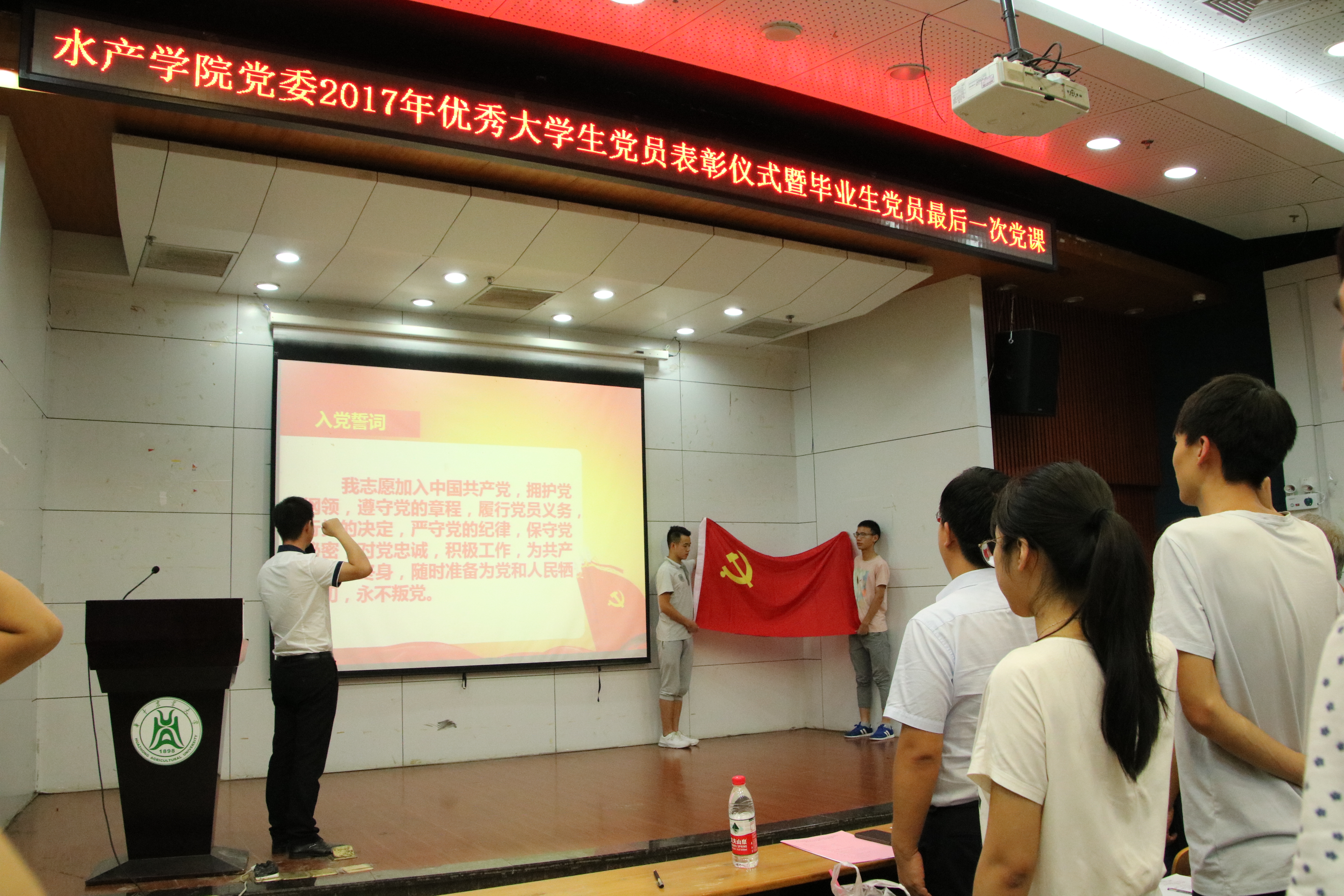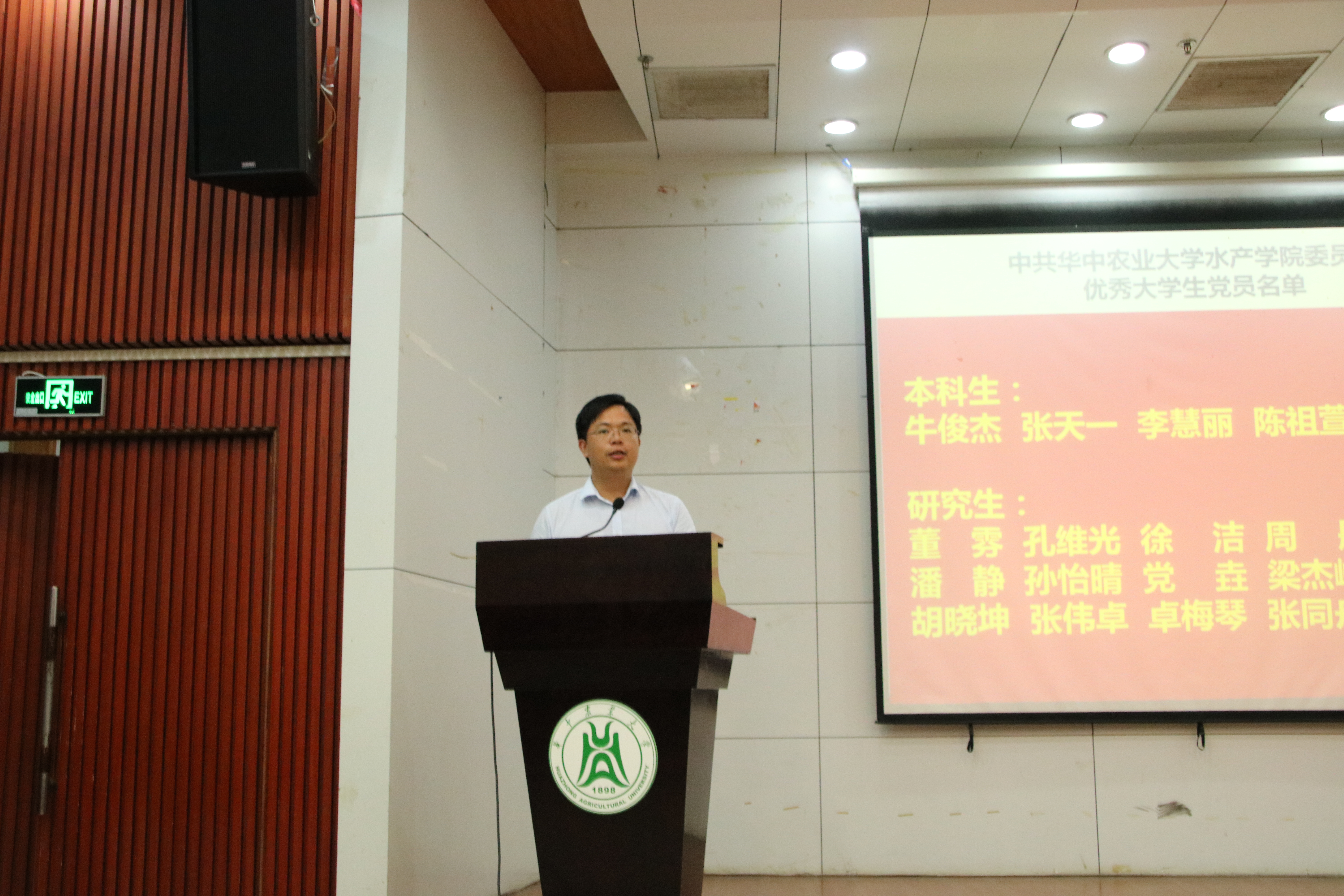 随后,学院党委书记张韶东为全体党员讲授了党课。他围绕牢记第一政治身份,做不忘初心的的人;努力践行党员职责,做有事业有作为的上善水产人;自觉遵守党纪党规,做两袖清风、一身正气、清正廉洁的人等三个方面展开讲述。他向大家提出要求:“作为一名真正的共产党员,要牢记一个党员的身份,勿忘初心,为党的事业努力奋斗;要牢记我们党全心全意为人民服务的宗旨,不辱使命。”他表示,临近毕业,大家可能会留恋、不舍,但是还是要勇敢的走出校门,去面对去经历社会风雨的洗礼,努力做一个对社会对国家有贡献的人。