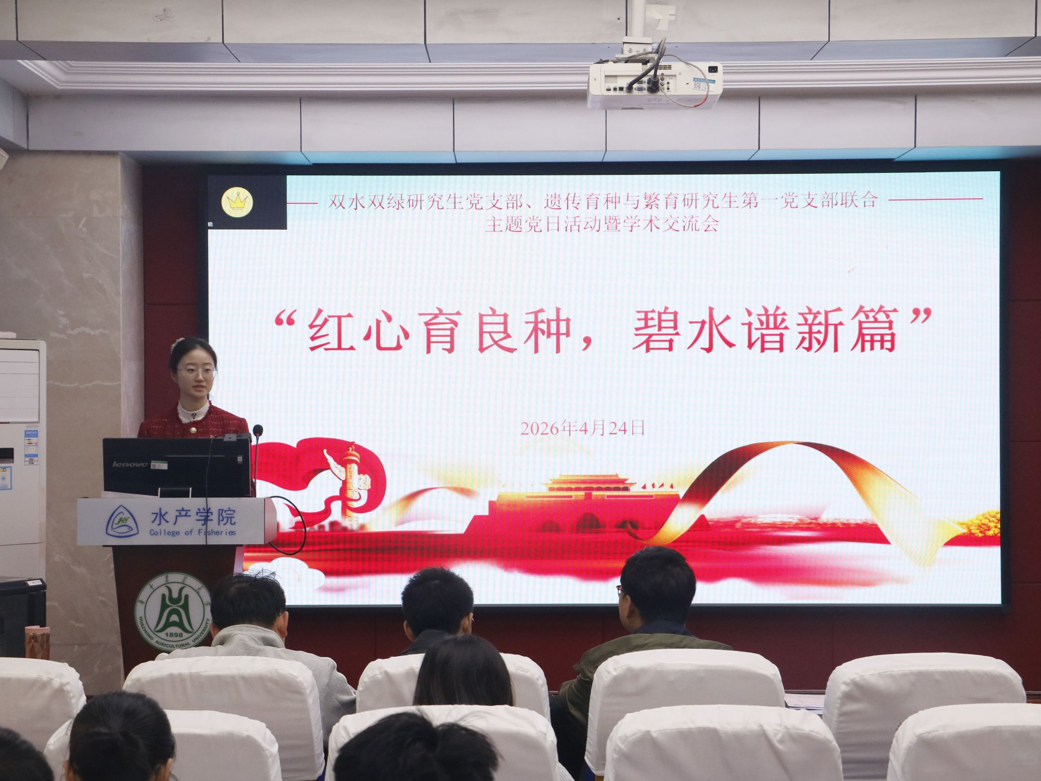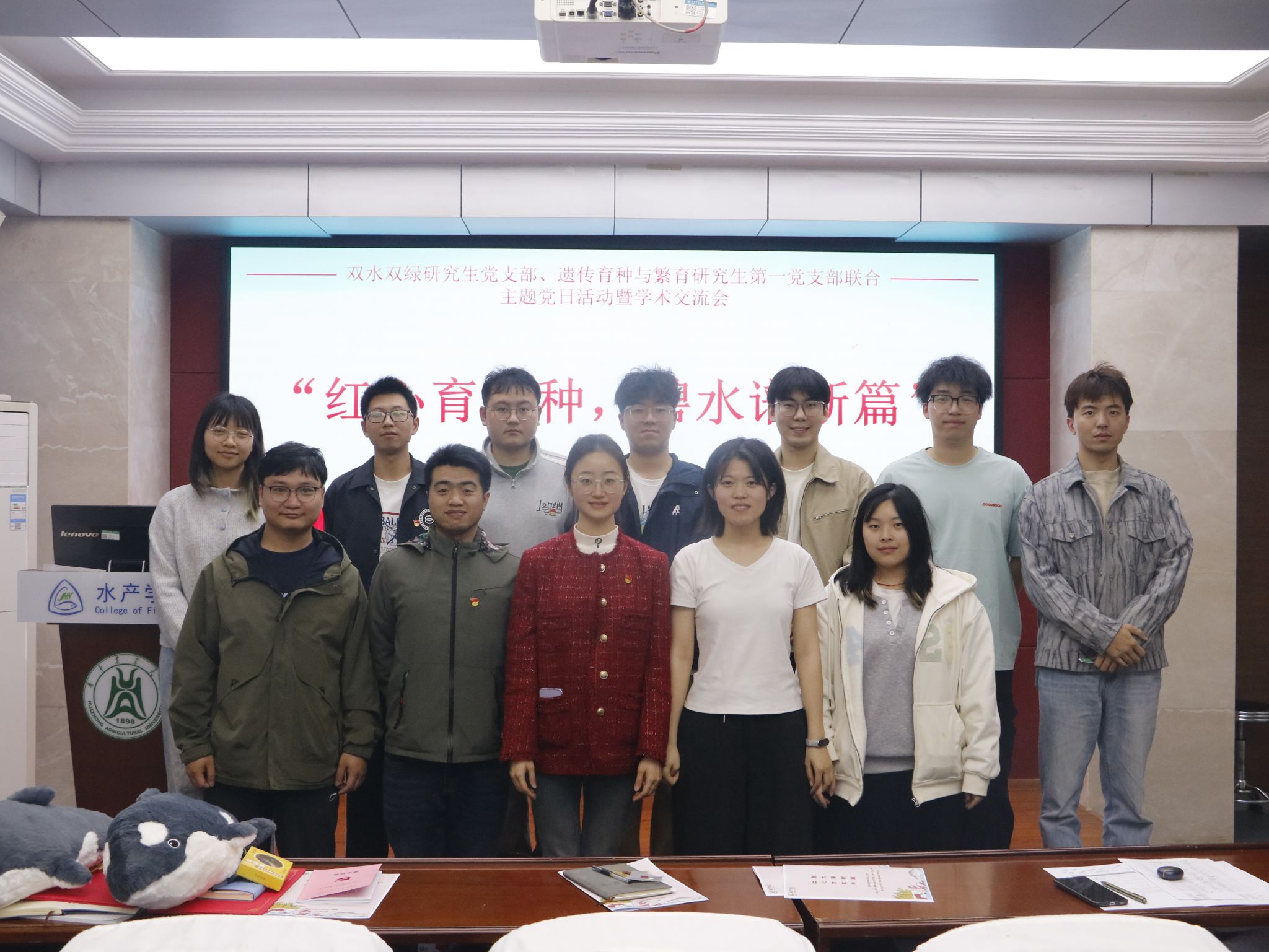 双水双绿研究生党支部与鱼类遗传育种与繁育研究生第一党支部在水产楼A105天辰报告厅联合举办“红心育良种 碧水谱新篇”主题党日活动暨学术交流会。