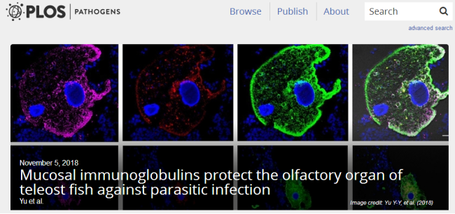 近日,学院鱼类免疫与病理学团队徐镇教授课题组在病原学领域杂志PLOS PATHOGENS 发表了题为“Mucosal immunoglobulins protect the olfactory organ of teleost fish against parasitic infection” 的研究论文。该研究首次揭示了低等脊椎动物鼻腔黏膜在抗寄生虫感染过程中的适应性免疫应答机制。