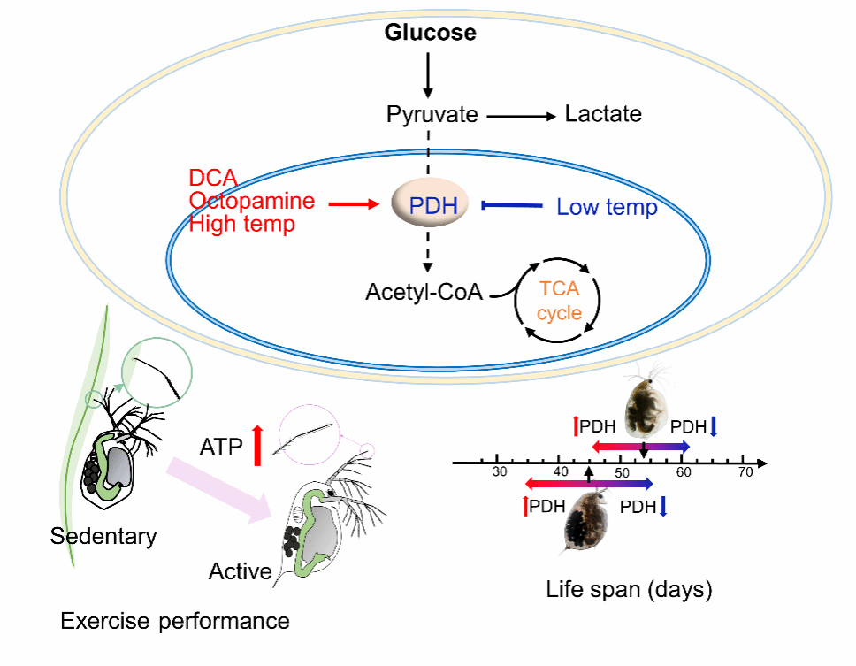 研究通过代谢组学分析筛选到丙酮酸脱氢酶(PDH)很可能作为导致两者代谢差异的潜在靶点;进一步的药物实验,揭示了丙酮酸脱氢酶(PDH)活性与寿命之间的负相关关系:PDH活性的降低不仅通过调节葡萄糖代谢以限制能量供应从而抑制老年低额溞的运动性能,还可通过调节能量代谢率进而延长其寿命。以上结果不仅暗示可能发现了一个潜在的寿命调节靶点,还表明在临床上针对或间接调节PDH的药物可能对患者存在促衰老或缩短寿命的风险。在生物学领域,适度运动对健康的促进作用已被广泛研究。运动对代谢率的影响需要区分为即时效应(运动期间代谢率增加)和长期效应(通过锻炼有氧呼吸能力,总体代谢率降低)。老年低额溞的附着生存策略使其代谢模式趋近人类运动员的“运动后效应”——通过增强有氧代谢能力,形成静息状态下基础代谢率下降的适应性改变而使寿命延长。而活跃的中华溞终生持续游泳,类似于“不间断的即时效应”,导致其代谢率持续处于高水平,因此无法像运动员那样从运动的长期效应中获益。研究还发现,无脊椎动物神经递质章鱼胺(octopamine)和温度对PDH活性具有显著影响,并能调节枝角类寿命;而当温度或章鱼胺对PDH活性的作用被抑制剂或激动剂抵消时,其对寿命的影响则失效。上述研究结果为解析“运动促进长寿”的分子机制提供了新的无脊椎动物模型,为揭示能量代谢与寿命调节的关键分子机制提供了新见解。