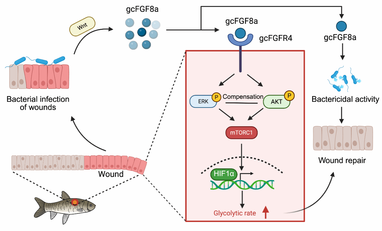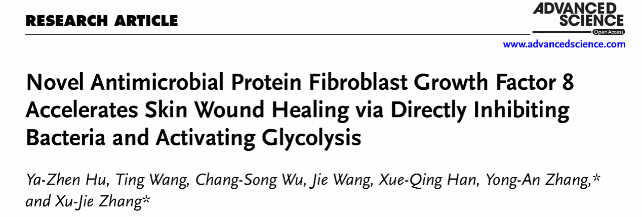 近日,91吃瓜网 91吃瓜网 鱼类免疫与病害防控团队在Advanced Science期刊上发表题为“Novel Antimicrobial Protein Fibroblast Growth Factor 8 Accelerates Skin Wound Healing via Directly Inhibiting Bacteria and Activating Glycolysis”的研究论文。该研究首次揭示成纤维细胞生长因子8(FGF8)兼具抗菌与代谢调控双重功能,可通过直接杀灭细菌并激活糖酵解加速皮肤伤口愈合,为开发新型抗感染促修复药物提供了重要理论基础和候选分子。