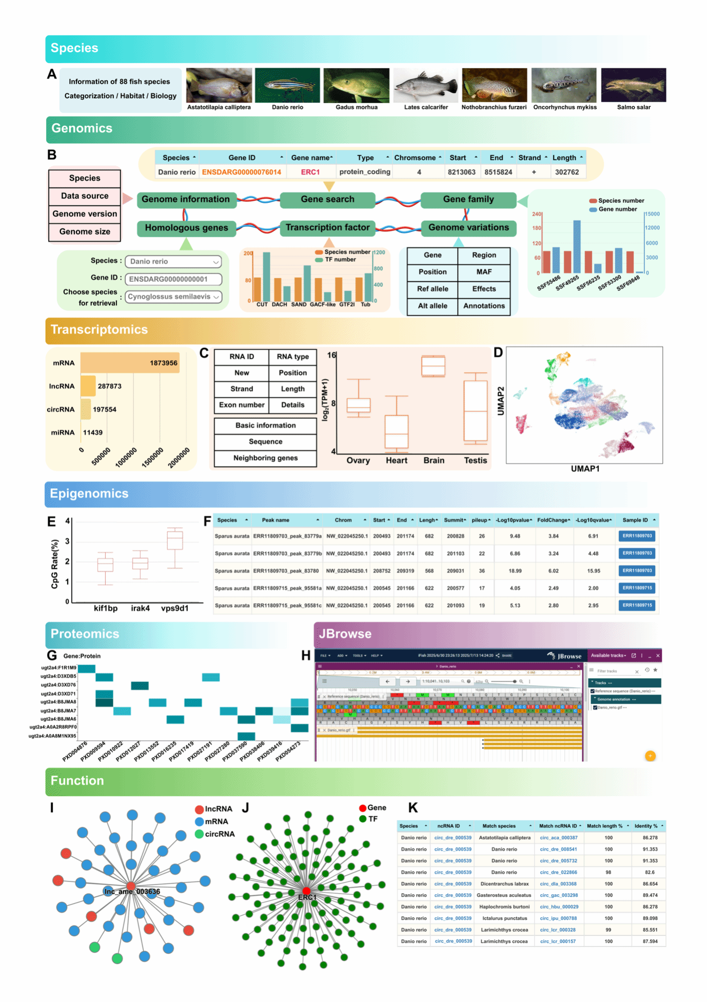 因此,研究团队系统收集并整合了88种鱼类(13377个样本、近40 T原始测序数据)的基因组、转录组、表观组和蛋白质组数据集,对数据进行了统一过滤、流程处理和分析(图1)。基于884个全基因组测序数据集,研究团队鉴定出1.37亿个单核苷酸多态性(SNP)和4552万个插入/缺失变异(InDel)。基于9797个RNA测序(RNA-seq)、293个单细胞RNA测序(single-cell RNA-seq)以及840个microRNA(miRNA)测序数据集,研究团队对多个物种不同组织中的187万个信使RNA(mRNA)、287873个长链非编码RNA(lncRNA)、197554个环状RNA(circRNA)和6068个miRNA进行了鉴定和定量分析。通过整合1563个表观组学测序数据集,iFish提供了全基因组范围的组蛋白修饰、染色质可及性、DNA甲基化及染色质互作图谱。此外,数据库还纳入了50个蛋白质组学项目,用于蛋白质表达谱分析。为方便基因分析,研究团队收集了88种鱼类的基因组信息,整理了270万条基因注释条目,鉴定了同源基因,注释了192107个转录因子(TF),构建了转录因子调控网络和基因共表达网络,并对各类RNA进行了跨物种保守性分析。
