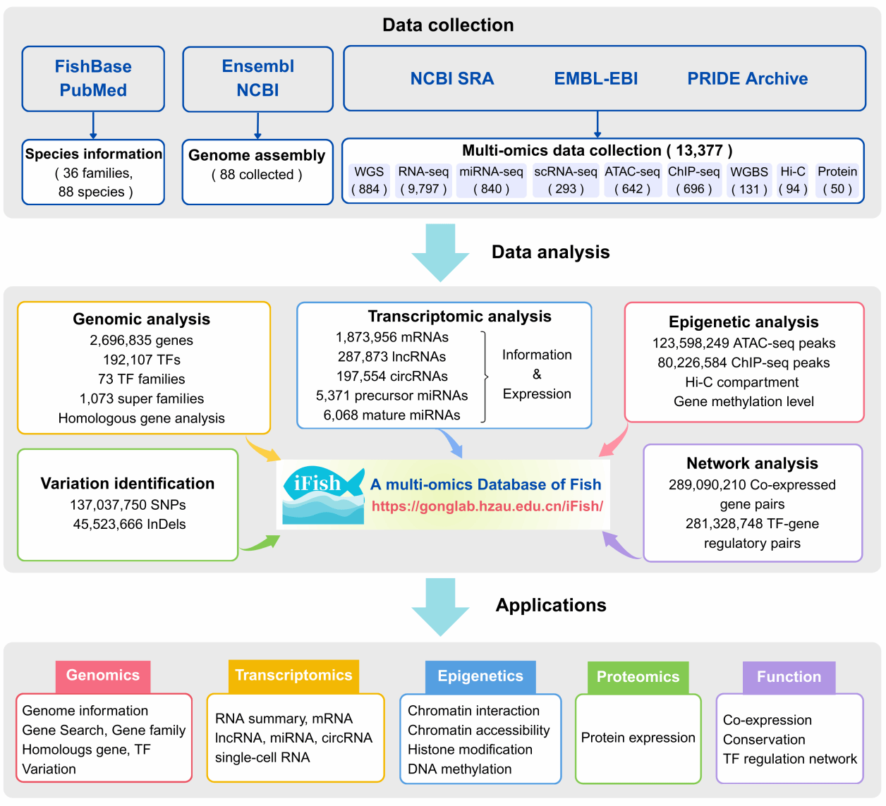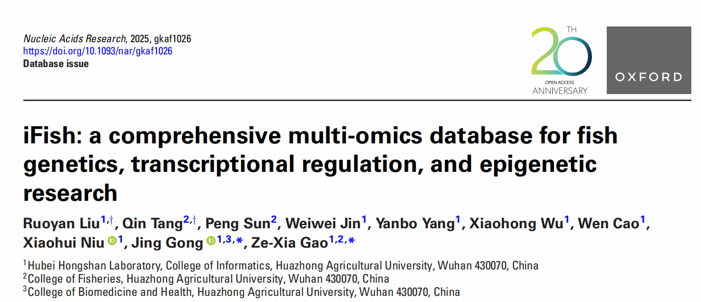 近日,91吃瓜网 高泽霞教授团队联合信息学院龚静教授团队在Nucleic Acids Research期刊上发表题为“iFish: a comprehensive multi-omics database for fish genetics, transcriptional regulation, and epigenetic research”的研究论文。该团队开发的“iFish”综合性鱼类多组学数据库(//gonglab.cgw-91.org/iFish/),不仅整合了基因组图谱、基因表达谱、表观遗传修饰及蛋白质组数据,还实现了遗传变异、转录因子(TFs)及非编码RNA(ncRNAs)的系统鉴定。它是迄今为止系统整合、分析和存储鱼类多组学数据的最全面平台,将成为鱼类遗传学、转录调控和表观遗传学研究的重要资源。