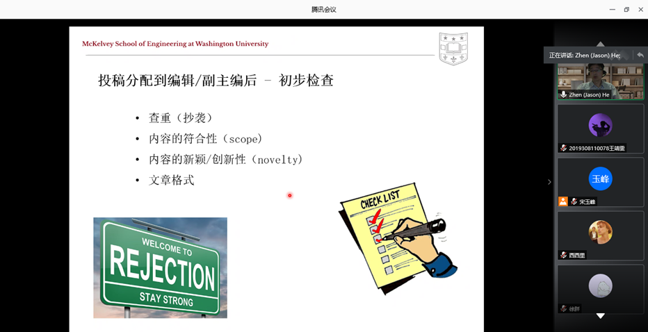 第20008期水产讲坛学术活动通过腾讯会议在线上举行,美国圣路易斯华盛顿大学的贺震教授作题为“如何发表高水平科研论文”的报告。贺震教授目前担任多个期刊的主编、共同主编,拥有丰富的审稿经验,了解审稿的流程。本次报告面向全院师生,由学院教授罗智主持。