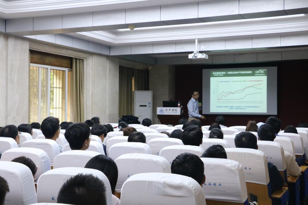 水产讲坛,以“鱼类生殖细胞发育与快速定向育种”为题进行学术报告。报告于水产楼109天辰报告厅举行,高泽霞教授主持报告。